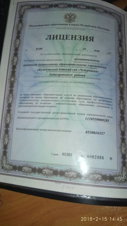 | Полное наименование образовательной организации* | Муниципальное казенное дошкольное образовательное учреждение "Кужникский детский сад"Чебурашка" |